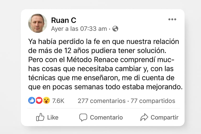 Durante más de 15 años, Ricardo ha acompañado a parejas casadas, separadas y al borde de la ruptura, ayudándolas a reencontrarse desde la empatía, la comunicación y el respeto mutuo. Su enfoque combina ciencia emocional, práctica guiada y estrategias de reconexión que funcionan incluso cuando todo parece perdido.